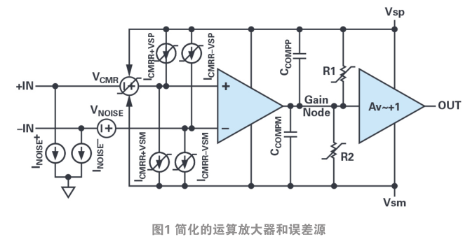 图1显示的是简化的运算放大器框图,并添加了交流和直流误差源。拓扑为带有输入跨导(gm)的单极点放大器,驱动输出缓冲单元的增益节点。尽管有许多运算放大器拓扑,但所示的误差源对它们全部适用。