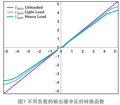 7 输出级失线中的最后一项是输出级,输出级在本文中被视为缓冲区。图7展示了一个典型的输出级转换函数。对于不同的负载,我们可看到4种误差。首先是削波:尽管假设该输出级的标称增益为1,但它不完全是轨到轨输出级。这种情况下,甚至空载输出时,每个电源轨也会削波100 mV。随着负载增加(降低负载电阻),输出电压会逐步削减。显然,削波会严重影响失真,而且必须降低输出摆幅才能避免削波。